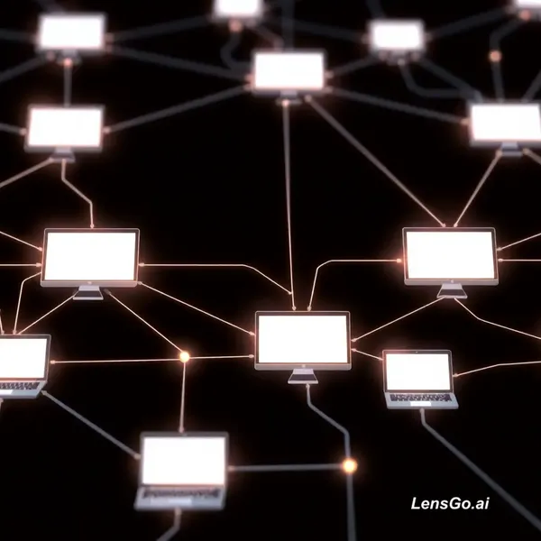 AI Image: Prompt Multiple computers connected with glowing lines forming a network diagram, technology illustr