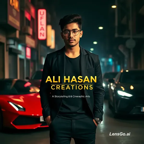 A cinematic wide YouTube banner, 8K resolution, featuring a stylish 22-year-old man (Ali Hasan) standing in a dark, moody street of Lahore with glowing neon lights. On one side, high-end luxury cars like a red Ferrari and a black Lamborghini are parked. Professional gold 3D text in the center saying 'ALI HASAN CREATIONS' with a sub-text 'AI Storytelling & Cinematic Arts'. Hyper-realistic, dramatic lighting, 16:9 aspect ratio."