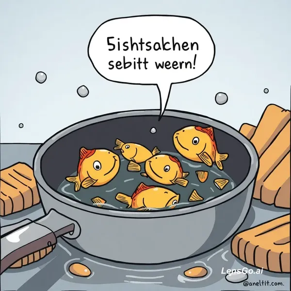 AI Image: Ein lustiges Comic Bild. Fischstäbchen die in der Pfanne gebraten werden. Es soll lustig dargestellt