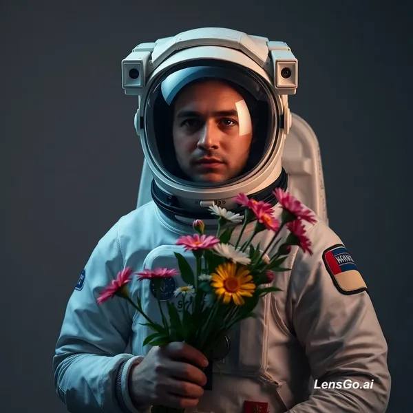 AI Image: Studio portrait of an astronaut holding flowers, dramatic lighting