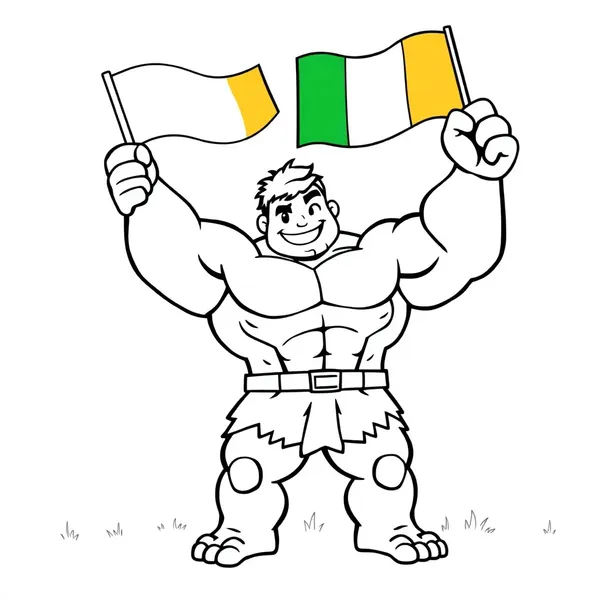 A simple black and white coloring page for kids of a big friendly superhero similar to Hulk, smiling and holding an Irish flag high in the air. The character should look strong but cartoonish and kid-friendly, with big muscles and a happy face. Clean bold outlines, minimal details, no shading, designed for easy coloring. The Irish flag waving proudly. Background simple with a few clouds and grass. Coloring book style, line art only, white background.