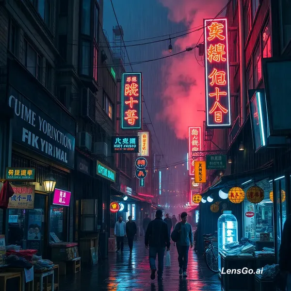 AI Image: Cyberpunk street market in the rain, neon signs and steam rising