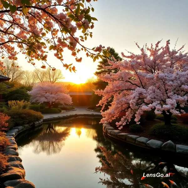 AI Image: A serene Japanese garden at golden hour, koi pond reflecting cherry blossoms