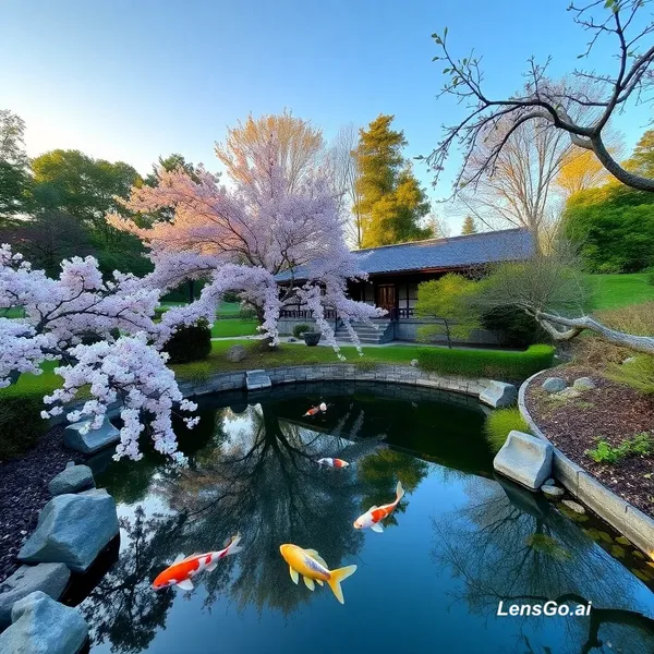 AI Image: A serene Japanese garden at golden hour, koi pond reflecting cherry blossoms
