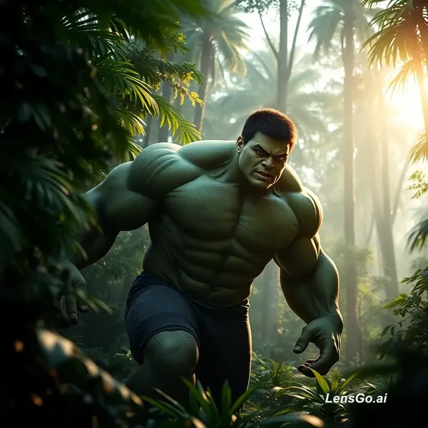AI Image: Hulk jungle mein ghoom raha hai Prompt: Hulk walking through a dense green jungle, massive muscular