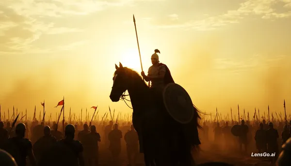 AI Image: Visual: A vast battlefield at dawn. Dust rising. Thousands of soldiers stand ready. War drums echo.