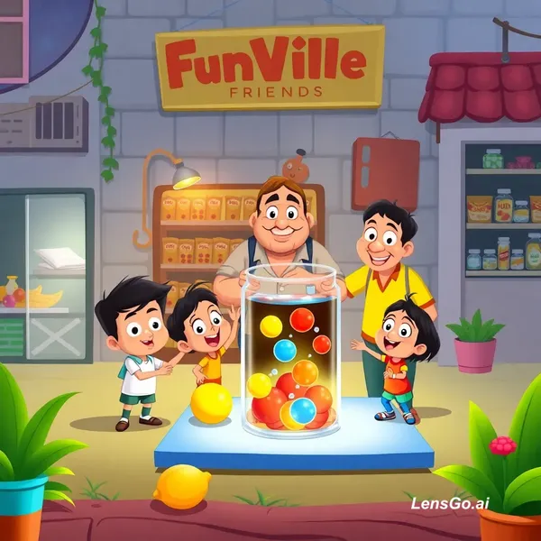 Create a colorful 2D animated cartoon in Disney/Pixar style, bright lighting, smooth motion, exaggerated expressions, kid-friendly comedy, fast pacing. Vertical 9:16 format. Setting: “FunVille Friends Society”, a cheerful residential area with a small snack shop. Intro (5 sec): Happy music. Show quick cuts — Jitu Bhai (funny man with mustache) sleeping in his toy shop, Dolly Bhabhi dancing happily, Tinku Team (5 kids) running and laughing, Aman Bhai arranging snacks in his shop. All appear together and say: “FunVille Friends!” Scene 1: At Aman Bhai’s shop. Tinku says: “Guys! Today we make a special juice!” Gogo (chubby, funny) says: “If there’s food, I’m ready!” Aman Bhai smiles: “Careful kids…” Scene 2: Kids mix cola, candy, lemon in a big glass jar. Add bubbling, glowing effects. Simi says: “This is our science experiment!” Rocky laughs: “Magic juice!” Scene 3: Jitu Bhai enters tired: “Aman Bhai, give me something cold…” Tinku secretly gives the juice. Jitu drinks it. Scene 4: Suddenly Jitu Bhai becomes super fast, moving and talking rapidly with funny motion blur. He shouts: “Dolly! Shop! Money! What is happening?!” Kids react shocked, then laugh. Piku says: “This is not magic… this is problem juice!” Scene 5: Dolly Bhabhi runs in: “Jituuu! What happened?!” Jitu runs like a rocket shouting: “I am a rocket!” End screen text: “Will Jitu Bhai become normal? Watch Part 2!”