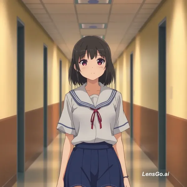 AI Image: Indian school girl in uniform, anime style, walking in school corridor, soft lighting, cinematic, re