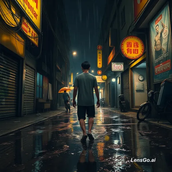 A dark, hyper-realistic anime-style cinematic scene set in Burrabazar, Kolkata at 2 AM. Heavy monsoon rain pouring aggressively, not romantic — dirty water overflowing from drains onto narrow गलियाँ, muddy puddles splashing under worn-out slippers. Flickering yellow streetlights reflecting on wet asphalt, broken neon signs buzzing softly. Camera starts with a wide aerial shot slowly descending into tight गलियाँ, showing chaotic wires, closed shops, and soaked posters peeling off walls. Cut to a low-angle tracking shot behind a lone young man walking through the rain, his chappals splashing in dirty water, clothes sticking to his body. Raindrops hitting realistically with physics-based splashes, puddles reacting dynamically. Close-up on his face — anime style but extremely realistic textures, tired eyes, wet hair sticking to forehead, subtle breathing visible in cold हवा. Side camera pan showing water flowing like small streams through the street, garbage floating, a stray dog shaking off water under a dim light. Occasional lightning flash illuminating the entire street for a second. Ultra-detailed environment, cinematic shadows, volumetric rain, realistic reflections, 4K HDR, film grain, shallow depth of field, emotional dark tone, anime realism fusion (like Makoto Shinkai style but gritty and raw).