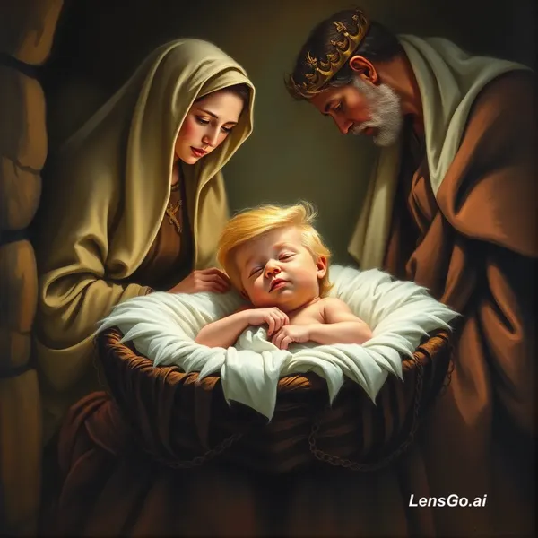 AI Image: Oil painting. Donald Trump as a newborn baby in a Maher in Bethlehem. His mother Mary and father Jos
