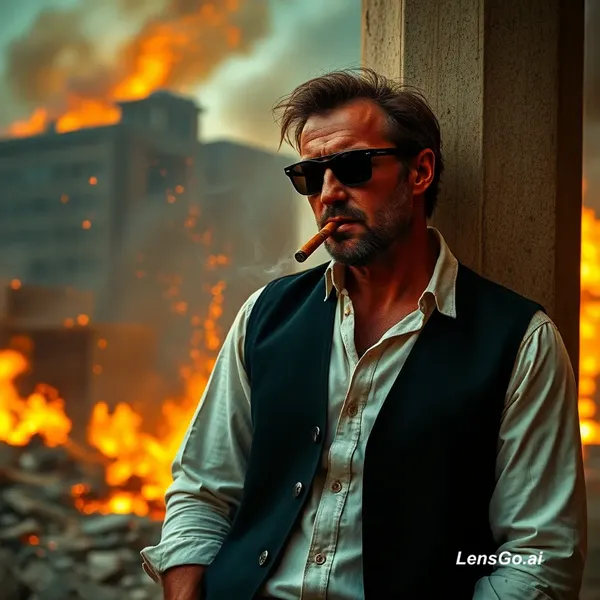 A cinematic slow-motion video of a serious man wearing a black vest, white dirty shirt and sunglasses, leaning against a broken concrete pillar in a burning city. He is smoking a cigar calmly while fire and explosions burn in the background. Sparks and embers floating in the air. Dramatic orange and blue lighting, intense atmosphere. The camera slowly pushes in toward his face, slight wind moving his hair and shirt. Fire flickering behind him, smoke moving naturally. Ultra-realistic, 4K, shallow
