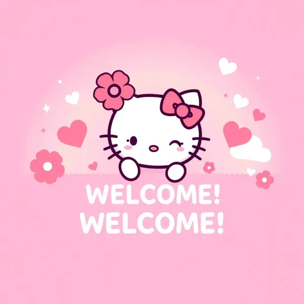 AI Image: kawaii hello kitty welcome banner, winking and waving, sparkles twinkling, hearts floating up and do