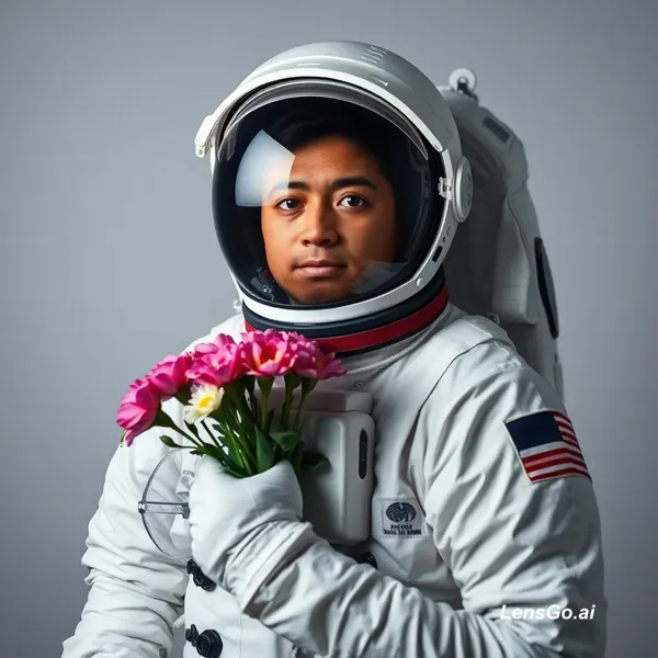 AI Image: Studio portrait of an astronaut holding flowers, dramatic lighting