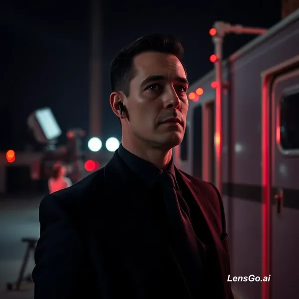 Cinematic shot of a professional security detail on a high-end film set at night. A close-up of a security professional in a sleek dark suit with a discrete earpiece, standing near a luxury trailer. In the background, blurred movie lights and technical equipment. High contrast, deep blacks, red ambient light accents, 8k resolution, professional photography.