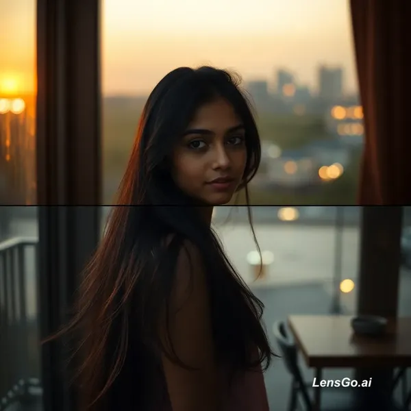 Create a cinematic vertical 9:16 video of a beautiful young Indian girl with long black hair and expressive eyes. She stands calmly while slightly moving her head and hair in slow motion. The same girl remains consistent in the whole video. The background smoothly changes every few seconds: 1. sunset field 2. balcony with city lights at night 3. window with soft rain outside 4. aesthetic cafe with warm lights Soft cinematic lighting, shallow depth of field, realistic DSLR look, emotional mood, slow motion movement, gentle wind in hair, ultra realistic, 4K quality.