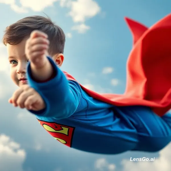 AI Image: I need you to provide me a color image of a baby boy that is flying through the sky in a Superman co