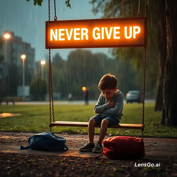 π§οΈ Scene 1: Lonely Child (Loneliness) A small boy is sitting alone on a swing in the park. Itβs raining, and sadness is clearly visible on his face. π This shows that he is going through some problem or failure in life. π Scene 2: Fallen Hope (Failure Moment) His school bag is lying on the ground, as if he has given up hope. π It symbolizes that he may have failed in school, exams, or some life goal. π Scene 3: Inner Pain (Emotional Struggle) The boy is looking down, with tears in his eyes. π This shows his inner pain, rejection, and the hurt caused by peopleβs words. π§οΈπ Scene 4: Darkness + Hope (Hope Begins) Along with the rain, a sunset is visible in the background. π It gives a strong message: "Darkness is never permanent β light is on its way." π‘ Scene 5: βNEVER GIVE UPβ (Turning Point) Above the swing, there is a glowing board that says βNEVER GIVE UP.β π This is the most important moment β as if the universe is signaling him not to give up. π₯ Scene 6: Spark of Motivation The boy is still sad, but this message creates a small spark of hope inside him. π This is the beginning of his comeback. π Final Message (Moral) π In life, failure and sadness will come, but if you donβt give up, success will definitely come one day. Cartoon 3D style