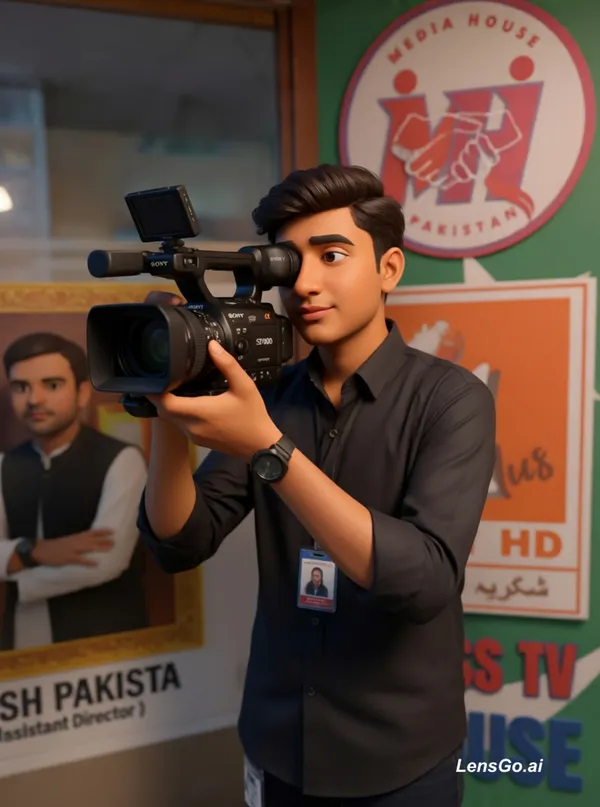 "6-second cinematic shot of a young cameraman standing confidently in a media studio, wearing a black shirt, holding and recording with a Sony SD1000 camera. The cameraman adjusts focus and slightly moves the camera forward as if capturing a news scene.