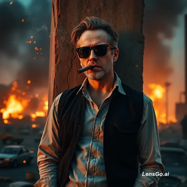 A cinematic slow-motion video of a serious man wearing a black vest, white dirty shirt and sunglasses, leaning against a broken concrete pillar in a burning city. He is smoking a cigar calmly while fire and explosions burn in the background. Sparks and embers floating in the air. Dramatic orange and blue lighting, intense atmosphere. The camera slowly pushes in toward his face, slight wind moving his hair and shirt. Fire flickering behind him, smoke moving naturally. Ultra-realistic, 4K, shallow