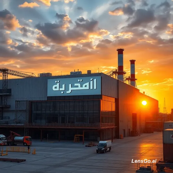 Modern industrial factory building at sunset, large modern factory with metal structures and glass, big professional sign on the building written in Arabic "مصنع محرز", cinematic lighting, realistic photography style, ultra detailed, clean industrial area, trucks and workers around, dramatic sky, 4k, professional commercial photo