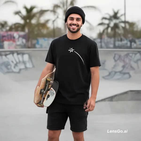 can do make a photo of a white male with a little Hispanic look on him whilst wearing a black beanie, black jorts and this shirt this is the front also give him a skateboard in his arm holding it while smiling into the camera