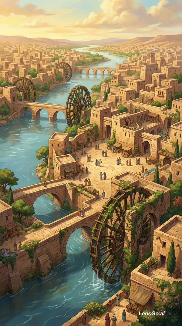 { "nano_banana_prompt": { "scene_type": "epic cinematic animated environment", "characters": "none", "reference_images": { "architecture_reference": { "1": "ancient Hama stone city and dense stacked houses", "2": "stone bridges and riverbanks", "3": "Hama norias massive water wheels", "4": "old Syrian courtyards and terraces", "5": "medieval Syrian urban textures" }, "art_style_reference": { "6": "The Prince of Egypt hand-painted cinematic background", "7": "DreamWorks epic animation city environments", "8": "highly detailed hand-drawn animated architecture", "9": "cinematic animated landscape with painterly textures" } }, "environment_concept": { "city": "ancient Hama", "scale": "gigantic monumental city with multi-layered topography", "composition": "wide cinematic shot from central plaza, showing river splitting city, massive norias integrated with buildings, and distant elevated city areas", "atmosphere": "majestic, springtime, lush greenery everywhere, full of life" }, "river_scene": { "river": "broad, deep, flowing Orontes river dividing city in two halves", "riverbanks": "stone embankments merging with buildings", "bridges": "grand ancient stone arch bridges connecting city halves", "norias": { "scale": "huge, multiple, interwoven wooden water wheels", "integration": "partially e