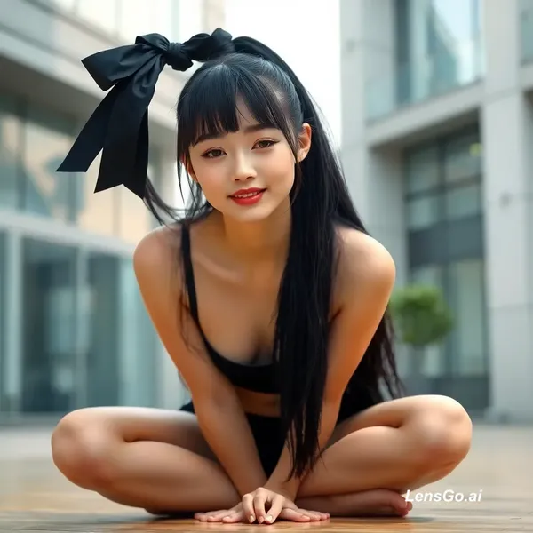 A highly detailed AI-generated image of a beautiful young Asian woman with fair skin, long straight black hair tied in a high ponytail with a black ribbon bow, straight bangs framing her forehead, large expressive eyes, small nose, soft pink lips, and a neutral,eyes closed and mouth slightly open as an expression of ecstasy or pleasure with a climax movement, Pose in a deep squat position on the floor with legs wide apart, knees bent, hands resting on thighs, feet flat on the floor.eyes closed and mouth slightly open as an expression of ecstasy or pleasure with a climax movement, Pose in a deep squat position on the floor with legs wide apart, knees bent, hands resting on thighs, feet flat on the floor.Blurred background featuring modern buildings, windows, and soft natural daylight, creating a serene and innocent atmosphere. Ultra-realistic, photorealistic style, high resolution, sharp focus, natural lighting, subtle bokeh effect.