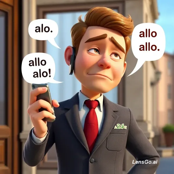 AI Image: Homme en cartoon 3D style Pixar avec portefeuille rempli d’argent et téléphone, disant "allo allo al