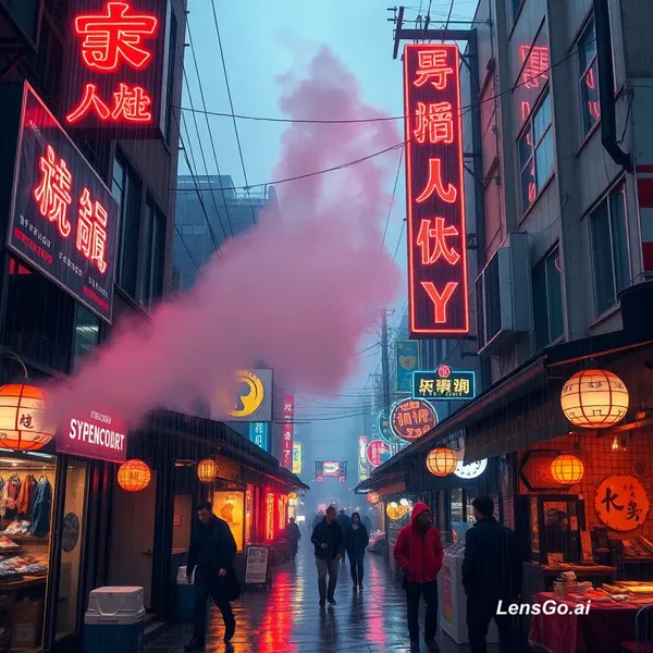AI Image: Cyberpunk street market in the rain, neon signs and steam rising