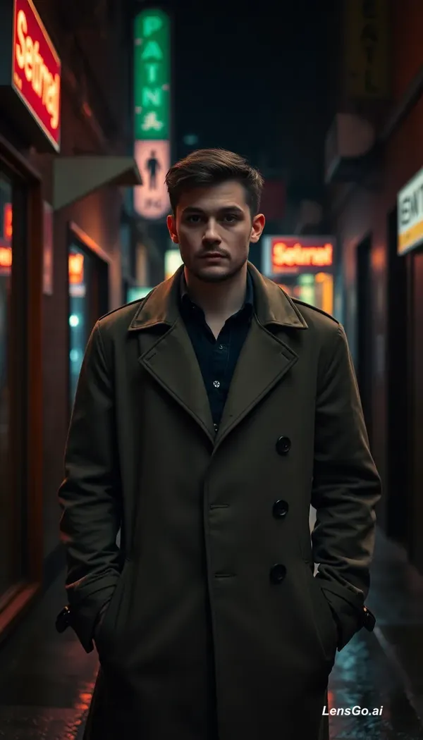 A 30-year-old young private investigator, standing still in a static pose, with nothing in his hands, fully visible from head to toe. He wears a slightly worn trench coat and has a sharp, observant gaze, subtle stubble, and a thoughtful expression. The scene is set in a dimly lit urban alley at night, with neon lights reflecting on wet pavement, creating a moody noir atmosphere. Cinematic lighting, high contrast, realistic style, full body shot, centered composition, shallow depth of field, dramatic shadows, highly detailed textures, film noir aesthetic, 4K resolution.