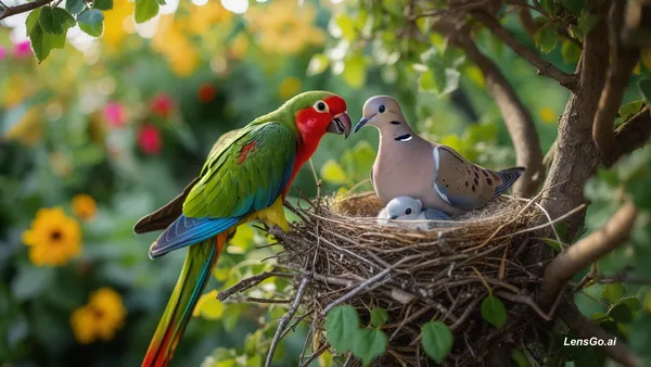 ایک خوبصورت باغ میں ایک کبوتر اور اس کی کبوتری رہتے تھے۔ انہوں نے ایک درخت پر پیارا سا گھونسلا بنایا ہوا تھا۔ ان کا دوست ایک باتونی طوطا بھی تھا، جو روز آ کر ان سے باتیں کرتا تھا۔ ایک دن کب, shot on modular 8K digital cinema camera, standard prime lens, 35mm standard natural perspective, f/1.4 shallow depth of field, creamy bokeh, professional cinematography, ultra-detailed, 8K resolution, film grain, cinematic color grading