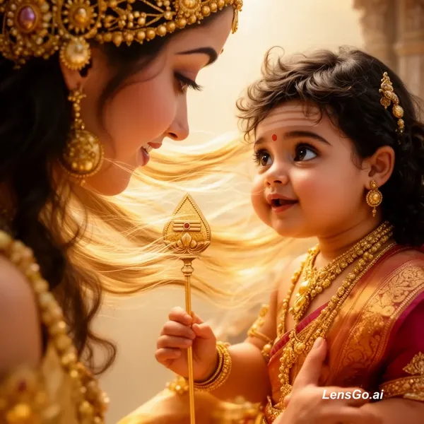 AI Image: A gentle divine breeze flows through the temple, softly moving the curly hair of Subramanya Swami an