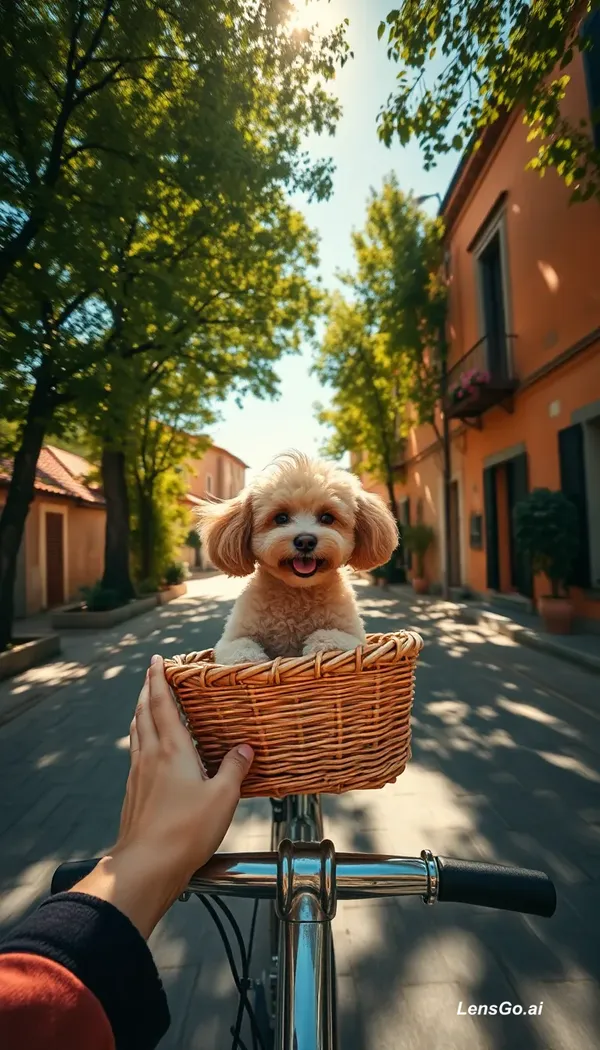 Wide-angle first-person view, hands of a young woman holding a bicycle handlebar, a wicker basket attached to the bike with a toy poodle inside. The dog's curly fur flutters softly in the breeze, head slightly raised, eyes squinting from the wind, with a cheerful and elegant expression. The bicycle rides along a narrow stone-paved road through an archway of tall green trees, sunlight filtering through the leaves, creating moving spots of light and shadow on the road and hands. Italian village details in the background: terracotta roofs, balconies with flowers, wooden shutters. Clear sunny day with a deep sky gradient from rich blue above to lighter near the horizon, sense of endless road perspective, calm warm atmosphere, gentle wind motion.
