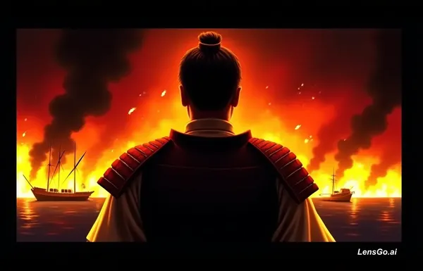 "Cinematic oil painting of a samurai warrior viewed from behind, standing solemnly before a battlefield. Massive fires engulf ships in the background with thick black smoke rising into a deep crimson sky. High contrast, dramatic chiaroscuro lighting, intense atmosphere, hyper-realistic textures, 4k resolution."