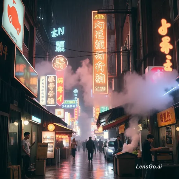 AI Image: Cyberpunk street market in the rain, neon signs and steam rising