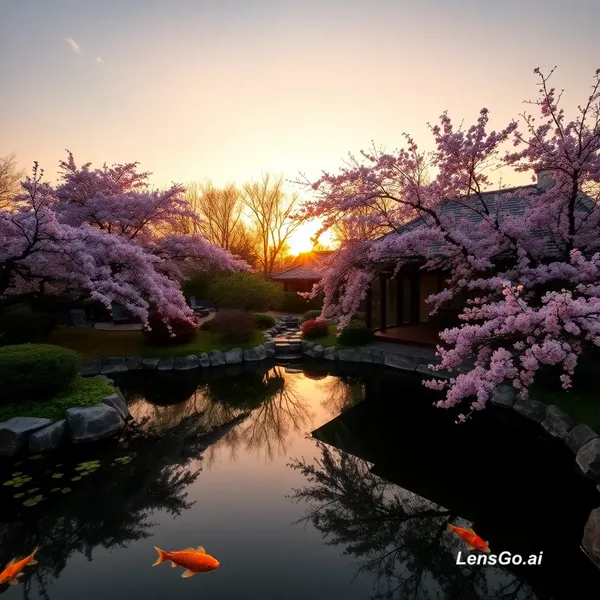 AI Image: A serene Japanese garden at golden hour, koi pond reflecting cherry blossoms