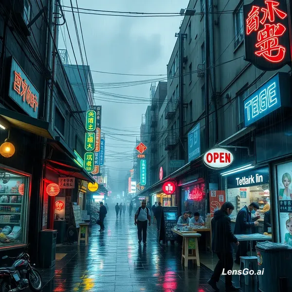 AI Image: Cyberpunk street market in the rain, neon signs and steam rising