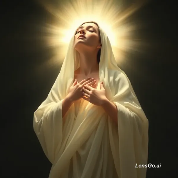 Madonna right before Christ’s birth, in ecstasy, levitating slightly, hands crossed over her heart, sheer white mantle with just a hint of flesh tone under a white shift, swirling luminous lights enlightening her closed eyes and upturned face, chiaroscuro technique, full figure, profile facing West