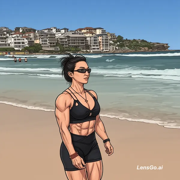 AI Image: convert this photo to cartoon style, an east Asian strong female body builder with lean muscle.