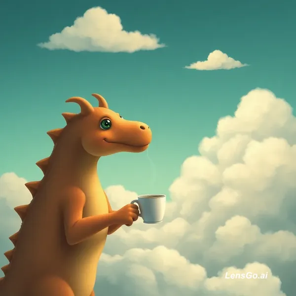 AI Image: a dinasour taking coffee from a cloud