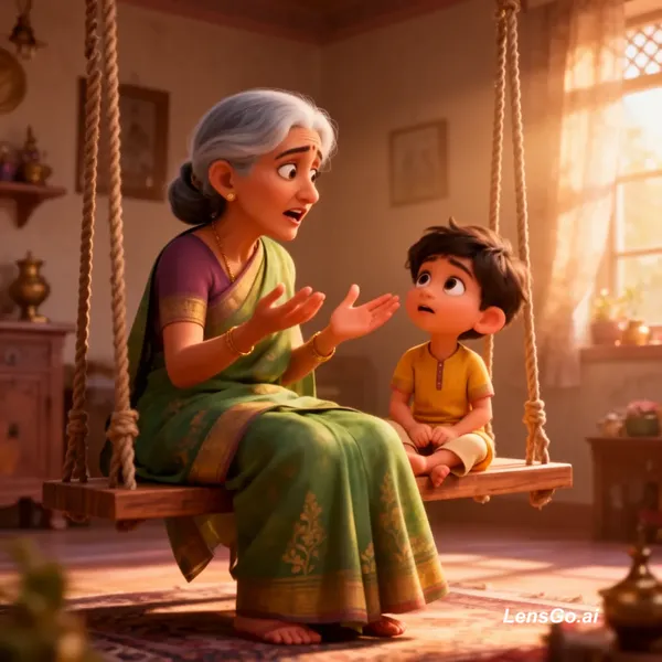 "An emotional 3D animation of an Indian grandmother sitting on a wooden swing (jhoola) with her little grandson. Warm sunlight, traditional Indian home setting. The grandmother is explaining something with hand gestures while the grandson looks at her with wonder. Soft cinematic lighting, high-quality textures, Pixar-style character design."
