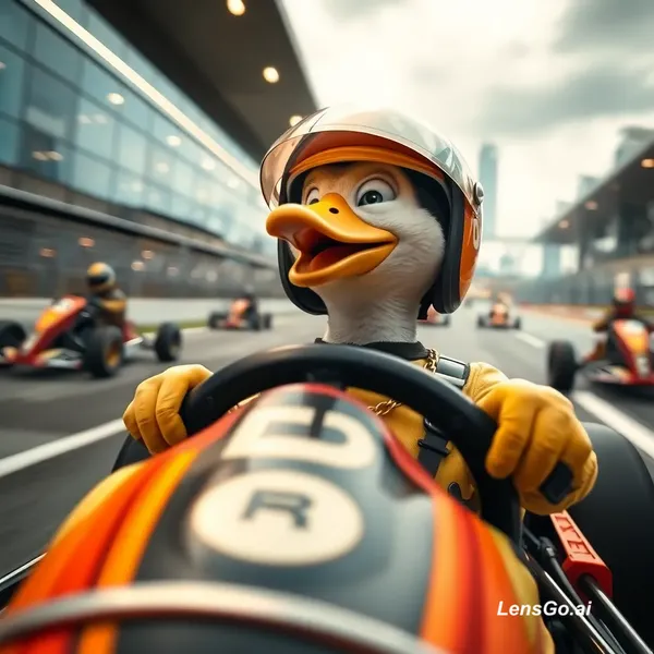 AI Image: Ultra-realistic wide-angle action shot of a duck wearing a racing helmet and a gold chain, driving a