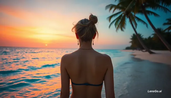 pristine tropical beach at golden hour, turquoise crystal clear water, palm trees swaying gently, cinematic sunset with orange and pink sky, professional travel photography. mujer cyberpunk sin bra