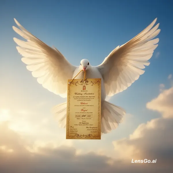 {"prompt": "Transform the provided wedding invitation card into a cinematic, ultra-realistic scene featuring a pure white dove flying in a bright blue sky with soft clouds, holding the invitation card delicately in its beak with a thin golden string. — preserve all text, fonts, layout, colors, and design without any change, distortion, translation, or stylization. The text must remain 100% identical, sharp, and clearly readable. Convert the flat card into a slightly realistic physical card while keeping its original appearance intact. Add subtle gold embossing and texture details. The dove should have highly realistic feathers, natural lighting, and elegant wings spread in flight. Use warm golden sunlight, soft glow, volumetric light rays, and depth of field for a premium cinematic look. Ensure the card is stable, centered, and fully visible with no warping or bending. Maintain high detail, rich colors, and realism.", "negative_prompt": "changed text, modified wording, blurred text, distorted fonts, extra text, missing text, warped card, low quality, pixelated, cartoon style, unrealistic bird, deformed wings,oversharpening, noise, artifacts, watermark, logo", "style": "cinematic, ultra-realistic, 8K, HDR, Indian wedding theme, elegant", "lighting": "golden hour sunlight, soft glow, volumetric lighting", "composition": "centered dove holding vertical invitation card, sky background with soft clouds", "resolution": "4K or 8K", "guidance_scale": 9, "seed": 54321 }