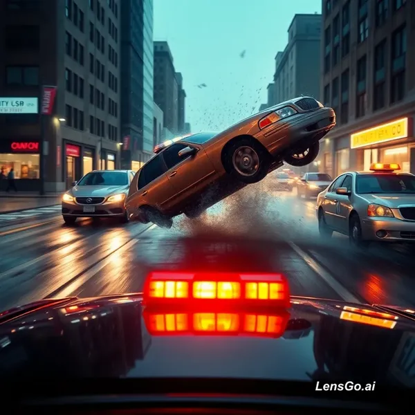 A cinematic, high-speed car chase at night on a wet city street during a rainstorm. The camera is mounted on the front hood of a police car, capturing the flashing red and orange emergency lights in the foreground. A silver sedan is seen speeding away through traffic, splashing through puddles. The police car accelerates, weaving through the wet streets to catch up. The chase reaches a climax when the silver sedan loses control, clips another vehicle, and flips over spectacularly in mid-air, spinning toward the camera amidst a spray of water and debris. The lighting is dramatic, with city neon and streetlights reflecting off the wet pavement.