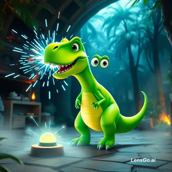 π¬ SCENE 1 β The Shrinking Moment (Hook) Prompt: A funny-looking bright green cartoon T-Rex named Rex, with smooth vibrant green scales, lighter green belly, big round expressive eyes, slightly oversized head, tiny arms, thick tail, and a goofy playful face, a talkative and highly expressive character mid-speech, standing inside a dense jungle laboratory filled with mysterious glowing elements and ancient stone technology, Rex pressing a glowing futuristic button on a small stone pedestal, the button emitting intense neon blue and green light, magical energy explosion radiating outward, shockwave of light particles and energy rings expanding, Rex beginning to shrink rapidly with magical distortion effect, his face showing extreme shock and humor as if shouting, glowing particles swirling around him, jungle trees towering in the background, cinematic fog, volumetric light beams, motion blur, dramatic lighting, depth of field focusing on Rexβs face, vibrant Pixar-style animation, ultra-detailed textures, whimsical and funny tone, Ultra-detailed 10K cinematic animation, Pixar-style 3D, volumetric lighting, depth of field, ultra-sharp focus, dramatic shadows, global illumination, highly detailed textures, soft cinematic glow, dynamic camera angles, shallow depth of field, expressive character, 8kβ10k resolution, high contrast, cinematic storytelling, hyper-realistic environment, no text, no watermark