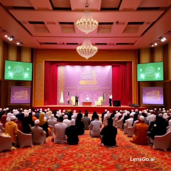 PROPOSAL FOR THE ORGANIZATION OF A NATIONAL QUR'AN COMPETITION. First Edition: Annual Initiative 1.INTRODUCTION This proposal outlines a comprehensive plan to organize a well-structured and impactful National Qur'an Competition. The initiative is designed to promote excellence in Qur'anic recitation, memorization, and understanding while fostering unity within the Muslim community. The competition is intended to become an annual national event, with this being the first edition, and will be held on the third day of Eid al-Adha (12/thulhijja/1447), a time when the Muslim community gathers in celebration and reflection. 6.EVENT ORGANIZATION AND SETUP A.Venue Setup Main stage for participants,Judges and MC facing the audience Audience seating arrangement Special guests sitting area Sound system and microphones Decoration reflecting Eid and Islamic themes Video and media coverage B.Logistics Registration desk Participant waiting area Media coverage section Food serving area. please generate for me an image for the event