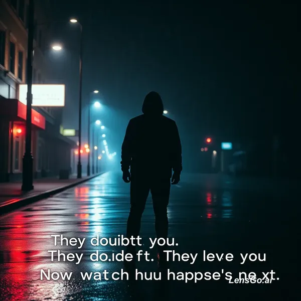 Create a dark, cinematic motivational scene with a moody atmosphere. Use low-key lighting, deep shadows, and dramatic contrast. Show a lone figure standing in the rain at night in an empty city street, illuminated by flickering streetlights and neon reflections on wet pavement. Add slow camera movement, subtle fog, and particles in the air for depth. The tone should feel intense, emotional, and powerful-symbolizing struggle, resilience, and inner strength. Include visual storytelling elements like clenched fists, determined facial expressions, and moments of silence before action. Color grading should be desaturated with cool tones (blues, blacks, and hints of red). Add cinematic effects like lens flares, film grain, and soft focus transitions. Optional text overlay: 'They doubted you. They left you. Now watch what happens next.' Style inspiration: dark cinematic trailers, high-end film production, epic motivational edits." If you want, I can tailor it for a specific platform (like short-form vertical videos, voiceover scripts, or a specific theme like gym, success, heartbreak, etc.).