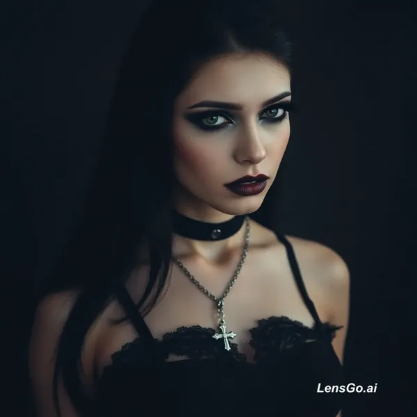 A high-quality portrait of a beautiful goth girl, dark aesthetic, heavy smudged black eyeliner, dark burgundy lipstick, wearing a black lace corset top, gothic silver cross necklace, long dark hair, moody lighting, cinematic shadows, 8k resolution, highly detailed skin texture big boobs