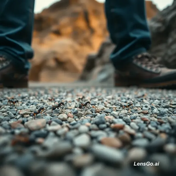 AI Image: Using this image as a reference, the person suddenly shrinks down to ant-size. The small pebbles on